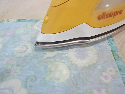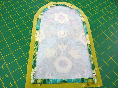 - Center the interfacing on the wrong side of the exterior panel so there is ½” of fabric showing beyond the interfacing on all side. Following manufacturer’s instructions, fuse in place.