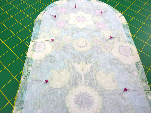 - Place the fused exterior panel and the plain lining panel right sides together. All edges of both layers should be flush. Pin in place.