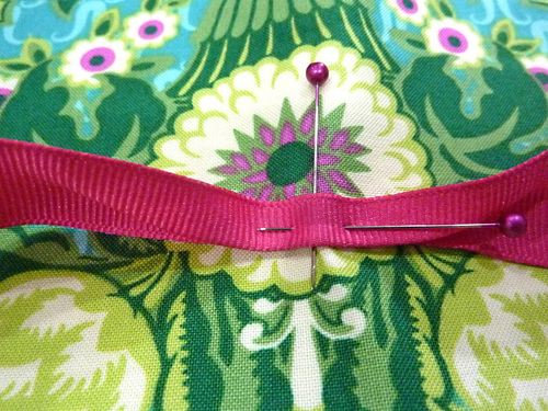 - Find the length of ribbon. Fold it in half to determine the exact center. At this center point, accordion fold the ribbon (fold it into thirds) to narrow the width. Pin the folded center of the ribbon at the marked point on the exterior side of the panel.