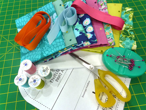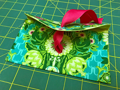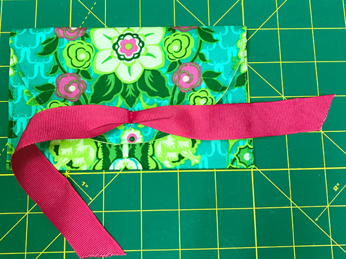 The envelope’s closure is particularly clever. A length of ribbon on the front of the pocket threads through a buttonhole at the top of the flap. The ribbon is pulled taut and tied into a beautiful bow. We used grosgrain ribbon in bold solids, which worked well with the colorful Violette. Should you choose a more subtle fabric, a satin ribbon would be a lovely accent.