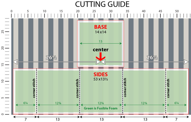 NOTE: The Cutting Guide drawing above, shows you how we fussy cut our striped panels and how the individual foam panels are cut and positioned. We are indicating how to center the cut for the base; you can – of course – position the base to one side or the other in order to create one larger remaining piece rather than two smaller pieces. The important step is centering the stripe.