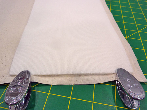- With the panel securely clipped in place, carefully flip the panel to the right side. At your ironing board, and following manufacturer’s instructions, fuse this first panel in place.