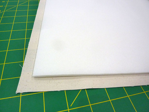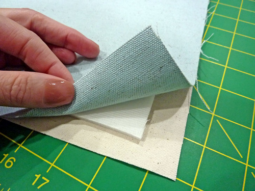 - Center the foam on the wrong side of the exterior base panel so there is ½” of fabric showing beyond the foam on all sides. Clip in place. Flip over the panel and fuse in place from the right side of the fabric.