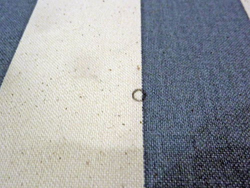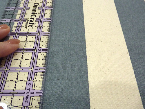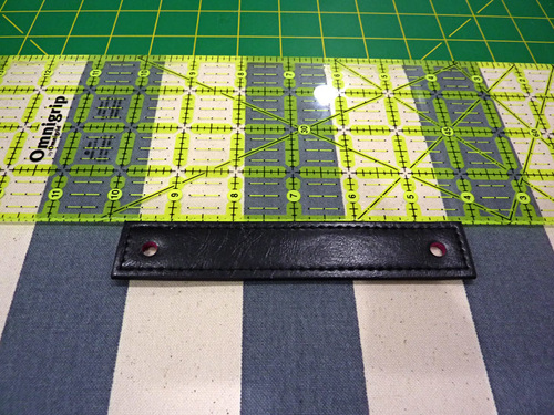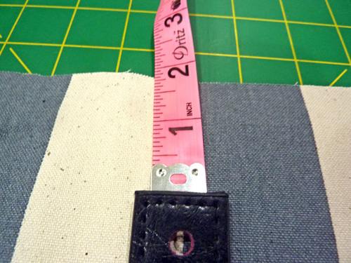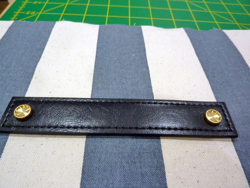 - For the larger, vertical handle we centered it top to bottom (1½” from the top and bottom raw edges) then centered it vertically over the intersection of two stripes on our fabric, setting it so the screw hole was approximately 4” in from the right line of topstitching. Your placement may vary based on your fabric choice. We liked the look of the off-set handle, but you could certainly choose to exactly center the handle top to bottom and side to side within the panel.