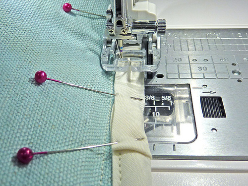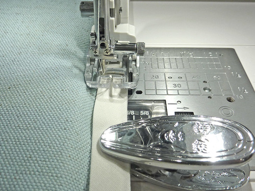 NOTE: Packaged bias binding tape has a slightly off-set fold. Place the slightly shorter side on top – on the side that will be facing up under the needle. This will help insure you catch both sides.