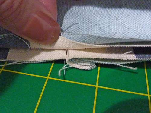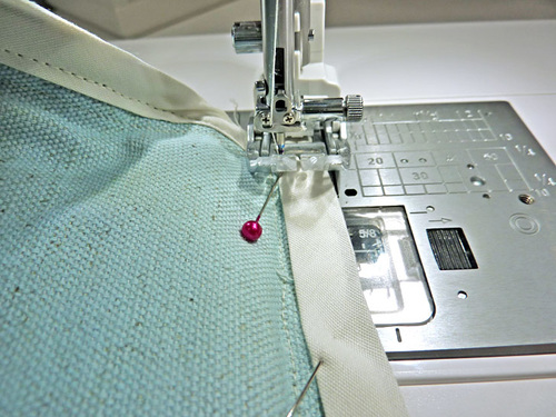 - Edgestitch along the inner fold of the binding tape through all the layers. Go slowly and carefully to insure you are catching both sides of the tape in this one seam. If your machine has the ability to adjust the needle position, use that feature to move your needle all the way to left to allow you to get as close as possible to the seam line.
