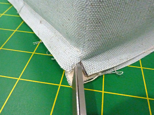 - In order to create the flattest base possible, clip into the corner of the tube at a diagonal, at a depth of about ⅜“. You are clipping right up to but not through your stitching line. This allows the fabric to ease so the corner flattens out.