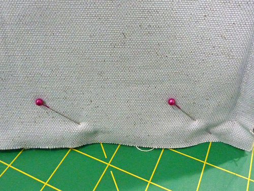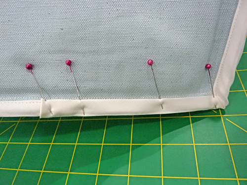 - Pin or clip in place around all four sections of the base panel seam allowance. You can fold in each corner at a diagonal, similarly to how you’d handle a blanket corner.