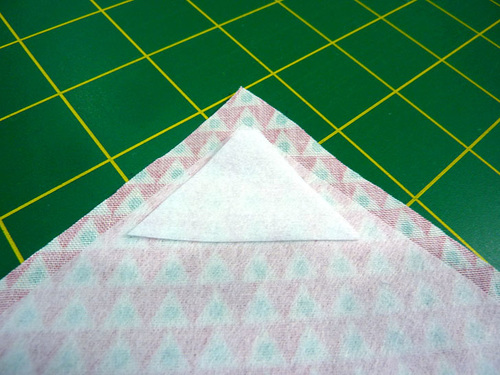 - Find one of the 1” mid-weight interfacing squares. Trim it into a triangle shape and fuse it at the point of the Snap Flap triangle with the mid-weight interfacing. This reinforcing layer goes over the main layer of interfacing on the wrong side of the fabric panel.
