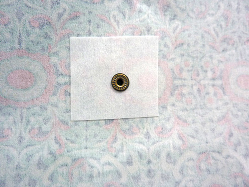 - Using your favorite method, cut a small hole at the marked point. We used the cutting tool that is part of the Dritz® Mini Anorak snap set along with a ball peen hammer.