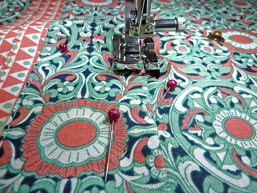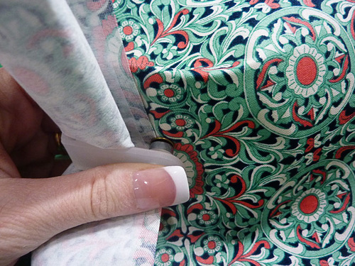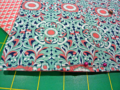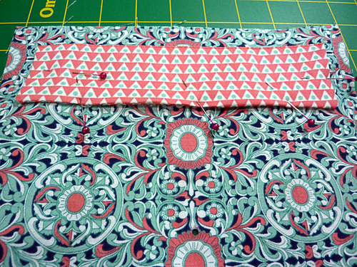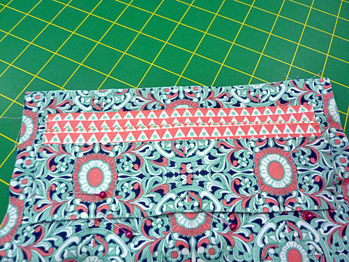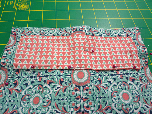 - Place the upper pocket in position first. Remember the top is the folded edge with the edgestitching. Pin in place along both sides and across the bottom.