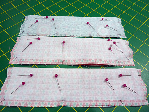 - Following the guide lines on the pattern, set the third pocket into position. The top of this final pocket is ½” below the top of the second pocket. Pin in place along both sides and across the bottom.