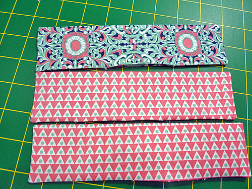 - Find the three credit card pocket panels. Fold each panel in half lengthwise and right sides together. Pin in place, leaving an approximate 2” opening on the long side of each.