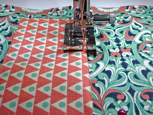 - Edgestitch along both angled sides. Remember to re-thread to matching thread if need be.