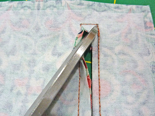 - Clip the point of the triangle, being careful to not cut into the sewn seam. There’s that little reinforcing triangle of interfacing.