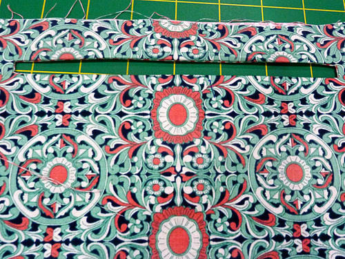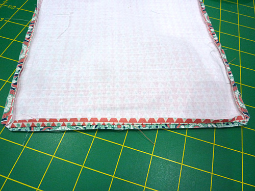 - Keeping the slightly lengthened stitch, edgestitch along both sides and across the bottom, pivoting at the corners. This seam seals the opening used for turning.