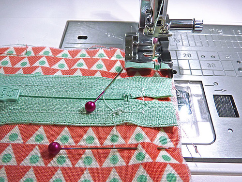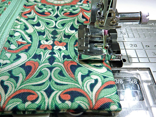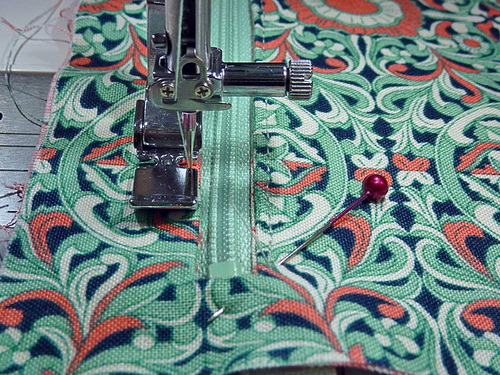 - Re-set the stitch length to normal. Edgestitch the zipper in place, using a Zipper foot. Go around all four sides, opening and closing the zipper as necessary to keep the zipper pull out of the way of the presser foot.