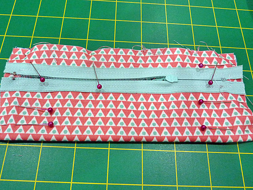 - Place the zipper behind the opening, centering the coil in the window. Pin in place.