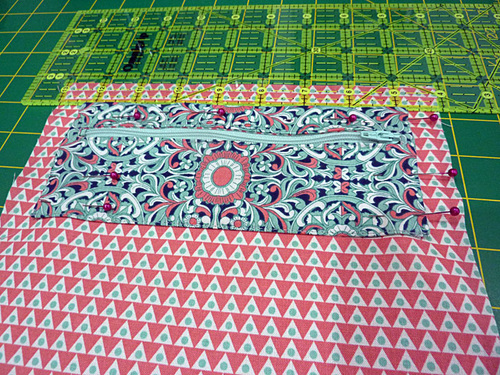 - Place the exterior zippered pocket panel (with the drawn box) right sides together with the lining zippered pocket panel. The raw edges of both layers should be flush. Pin together the layers.