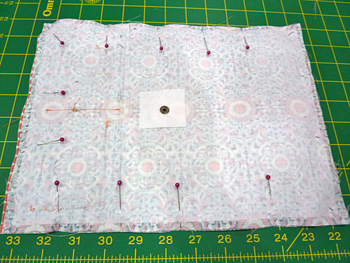 - Insert the pin all the way through the panel, then flip over the panel and set the remaining 1” square of mid-weight interfacing in place over this marked point. As above with the Snap Flap, this extra layer of interfacing acts as reinforcement for the snap.
