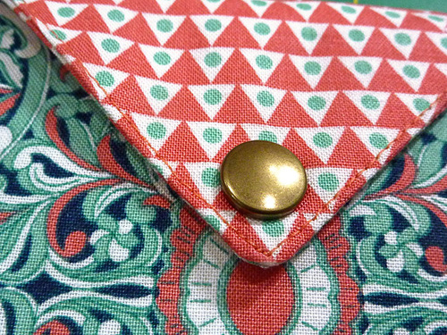 We recommend taking the time to do a great fussy cut on your exterior panel fabric. We originally used a fabric from our S4H stash: Florabelle Filigree from Joel Dewberry. The floral medallions were excellent focal points, with a stand-out pink medallion in the exact center, right where the point of the flap comes down to snap closed. This particular collection is an older one, and so is no longer readily available at retail, however, our wallet design would be gorgeous in any number of combinations.