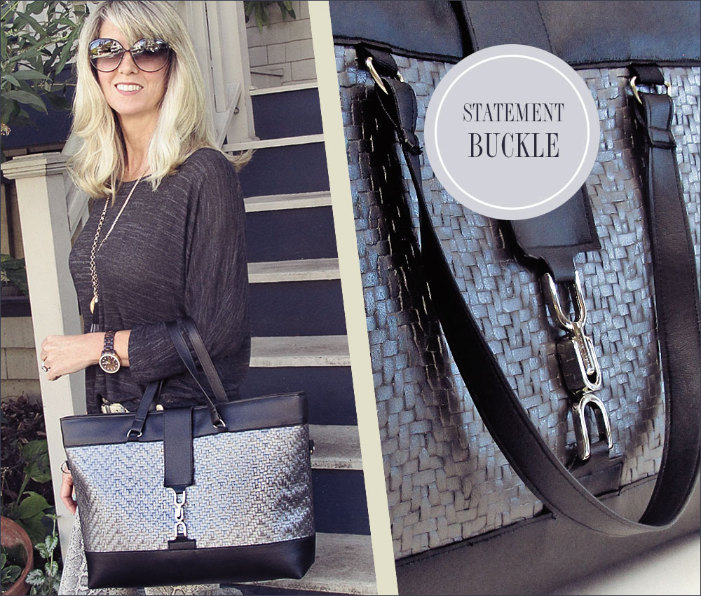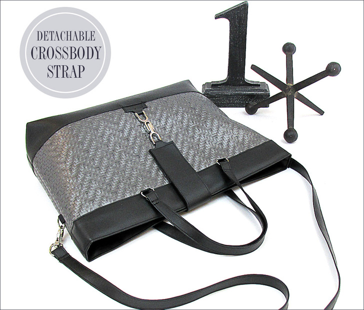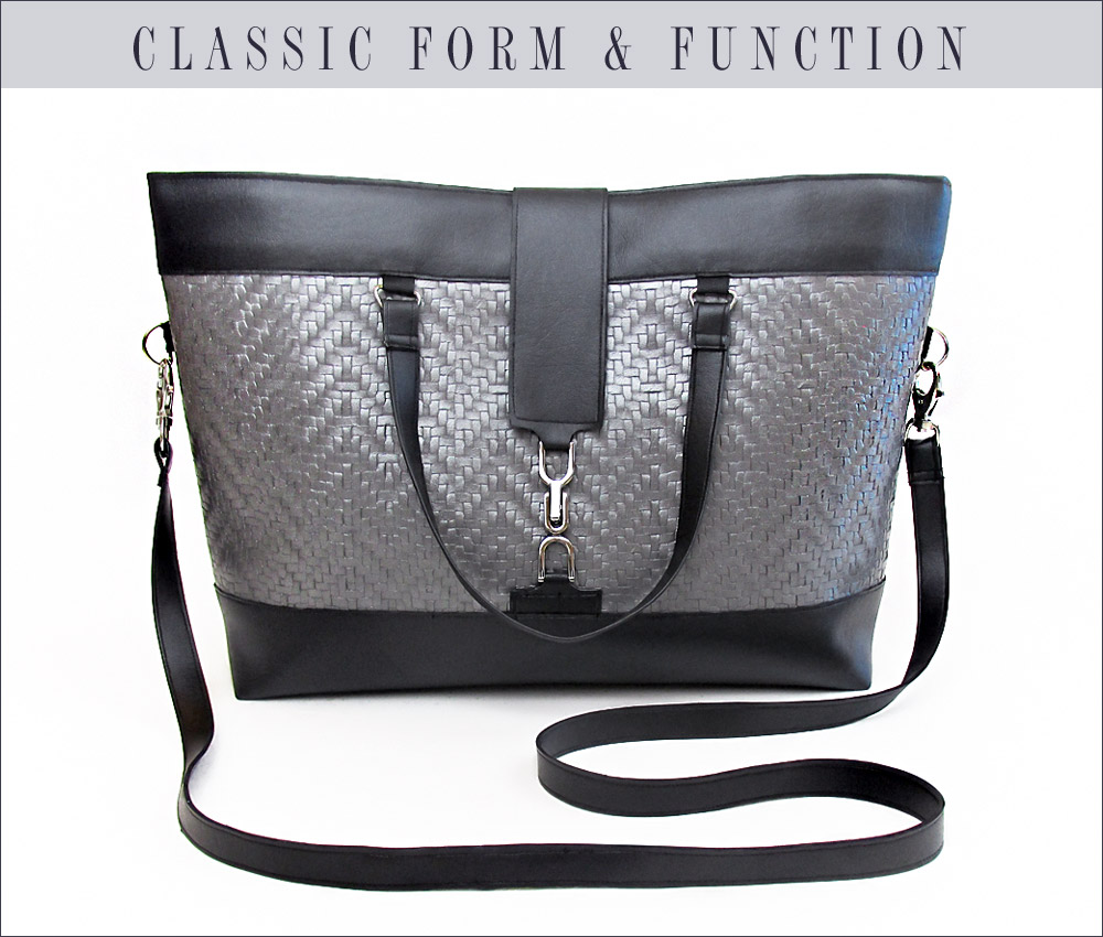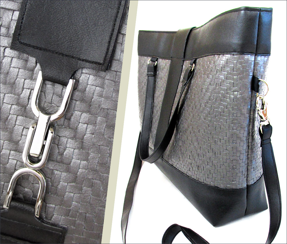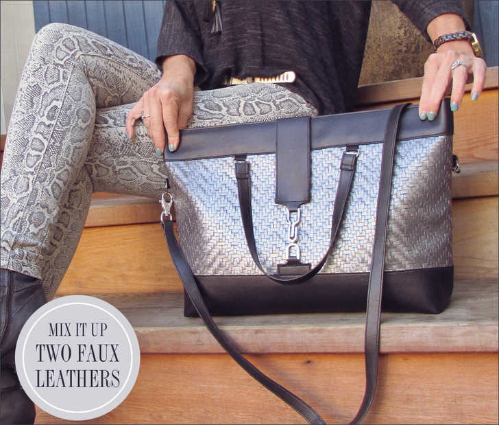 Sometimes all it takes to spark an idea is one great element. For this modern bag, we spotted a unique buckle and built outward from there. We used two different upholstery style faux leathers – one textured and one smooth. Of course, we’ve included lots of good tips and tricks for working with a vinyl substate to help you create the trendy look of our high-end boutique bag.