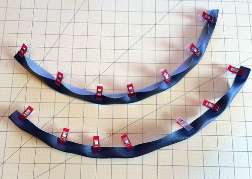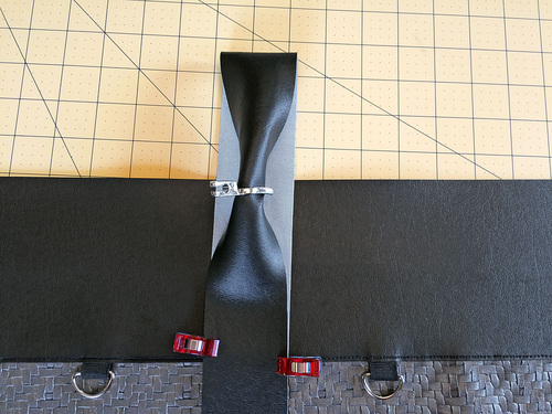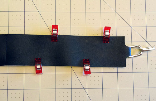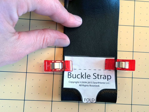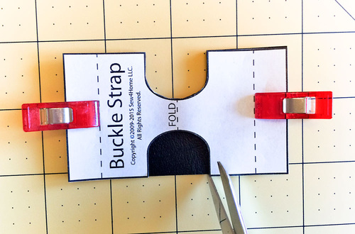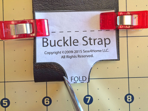 - With the buckle half still slipped up and out of the way, flatten the folded end of the strap. Find the strap pattern. Fold the pattern in half and align the fold line on the pattern with the actual folded end of the strap. Clip the pattern in place.