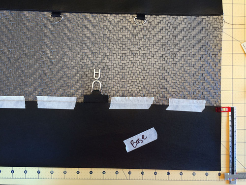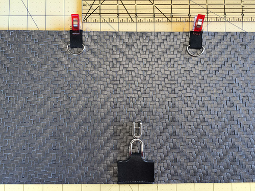 - Center the D-rings along the top edge of the center panel with 6″ between the two ribbon tabs. The raw edges of the ribbon should be flush with the top raw edge of the center panel. Clip in place.