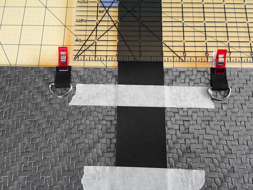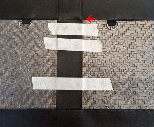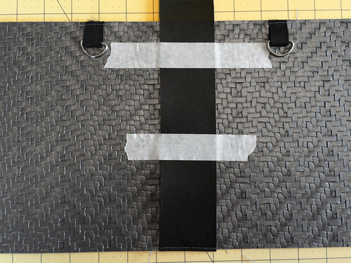 - Align the one end of the longer strap at the exact center along the bottom edge of the center panel. The raw edge of the strap should be flush with the bottom raw edge of the center panel. Clip in place at the base and tape across the middle so the strap lays flat.