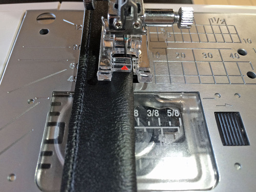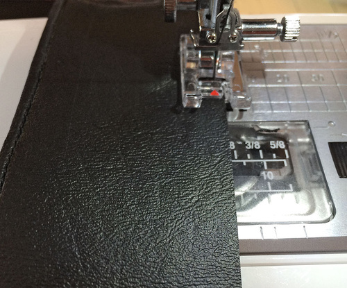 Another key to a good finish with faux leather is careful topstitching and edgestitching. Starting with a new, sharp needle and lengthening your stitch are important as is picking a presser foot that can help you keep your stitching straight and true. We like the Janome Edge Guide foot and the Janome Bi-Level foot. You can stitch over the surface with these specialty feet! If you experience any “drag” try slipping a sheet of wax paper between the foot and the surface of the vinyl. For other tips, don’t forget to review our Sewing with Laminates article.