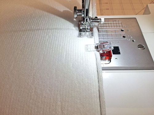 - Edgestitch through all the layers along the bottom of the accent band. As with the other stitching, your seam should run ⅛” from the cut edge. We used both our standard presser foot as well as our Janome Edge Guide foot for this final topstitching. At the bottom, you should be stitching right on top of the original seam that secured the top band to the center panel.