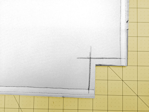 - Our bag is designed to have a 3½” base and sides. To create this width, we figured our corners at 1¾”. Cut a 1¾” square from each bottom corner. We drew in our stitching line ½” from the cut corner.