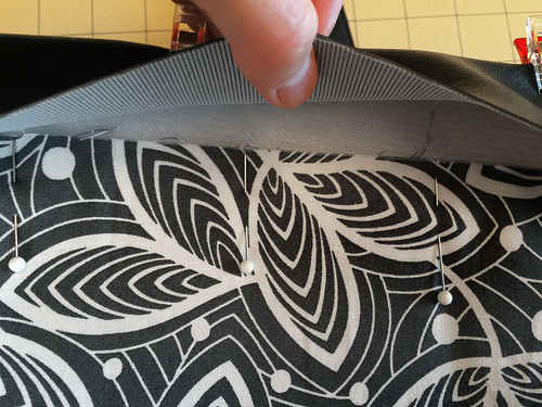 - The lining should extend under the band by approximately ½” – ¾”. We pinned the lining to the foam interfacing to keep it securely in position during the final stitching.