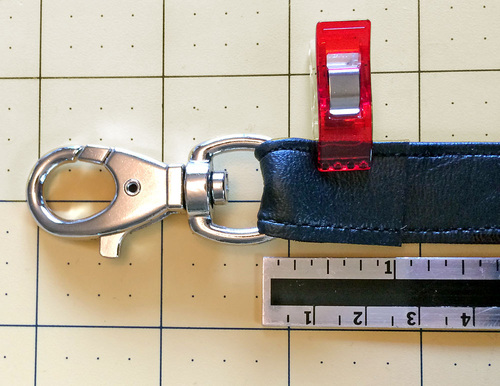- Find the permanent market and color the raw edges of the newly cut-out half circles and touch up the edges of the free end of the long strap as needed. Slide the buckle down into position and clip together the layers along both free sides.