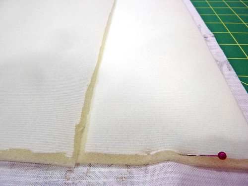 - Open up the tape and simply slip it over the seam allowance to conceal the raw edges. Pin the tape in place.