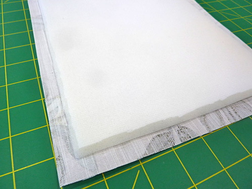 - Find the exterior base panel and the remaining foam panel. Center the foam panel on the wrong side of the exterior base panel so there is ½” of fabric showing beyond the foam on all four sides. Following manufacturer’s instructions, fuse in place.