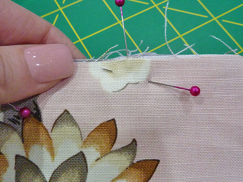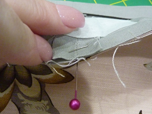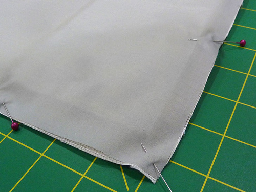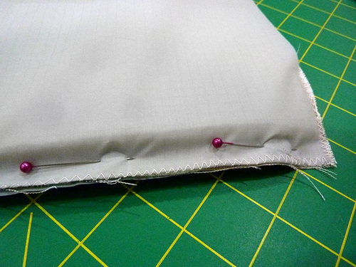- Pin in place around all four sections of the base panel seam allowance. You can fold in each corner at a diagonal, similarly to how you’d handle a blanket corner.