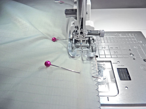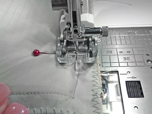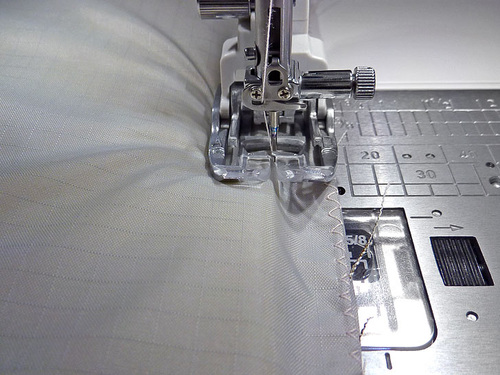 NOTE: As with all our presser foot recommendations, this is optional, but we do highly recommend it in order to keep these thicker layers moving together smoothly under the needle. - Baste the layered panels in place – the front, back, and base. You can use a traditional basting stitch, or as we did, use a finishing stitch instead. Both the exterior fabric we chose as well as the ripstop had a tendency to fray, so we basted together the layers with a zig zag stitch, keeping the right swing of the needle right along the raw edges of the layers.