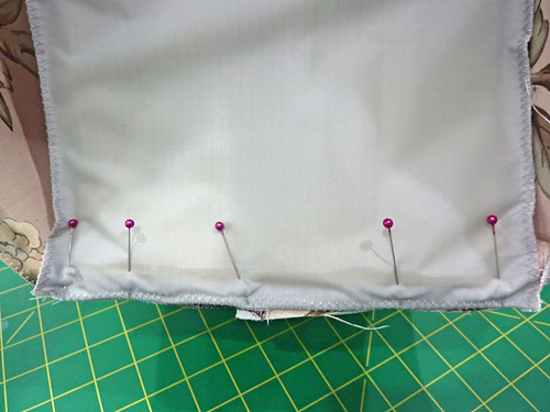 - Find the two pocket panels, one with interfacing and one without. Place the two panels right sides together. All four sides of both layers should be flush. Pin in place along both sides and across the bottom. The top remains raw.