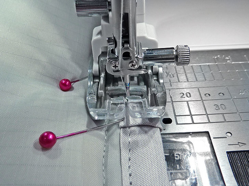 - Re-thread the machine with thread to best match the webbing in the top and bobbin. Slightly lengthen the stitch. Edgestitch the fold to secure. We are still using our AcuFeed™ Flex fabric feeding system and this – or a Even Feed or Walking foot is strongly recommended throughout construction.
