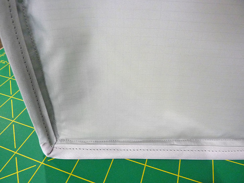 The panels of the exterior are layered wrong sides together with the lining panels. When sewn, it produces visible interior seam allowances that are then bound for a clean finish. This helps make construction simpler than a traditional lining and produces very smooth sides on the interior of the bag. We felt this was important for a bag designed to hold a lot of items in a variety of shapes and sizes; you don’t want to fight a loose lining when you’re in a hurry, pulling items in and out to get to your workout on time. If a bound edge just isn’t your cup of tea, no worries. You could select your favorite machine sewn seam finish. Don’t have a favorite? We have a four-part series on the subject with lots of great options from which to choose.