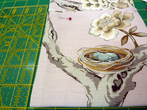 NOTE: We used a full yard in order to fussy cut our fabric’s pretty bird motif to best fit all the exterior panels. If you choose a fabric with a smaller or more random motif, you may be able to use less fabric. Take a look at the Getting Started section below to see the actual cuts required. - ⅓ yard of 45”+ wide mid-weight canvas, twill or similar in a coordinating solid for the accent trim; we originally used 54” Bentley Twill in Gray