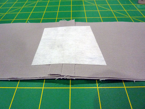 - Find one of the two pocket panels and the mid-weight interfacing panel. Center the interfacing on the wrong side of the fabric panel so there is ½” of fabric showing beyond the interfacing on all four sides. Following manufacturer’s instructions, fuse in place.