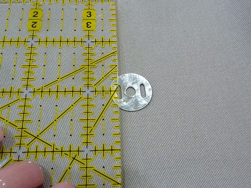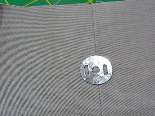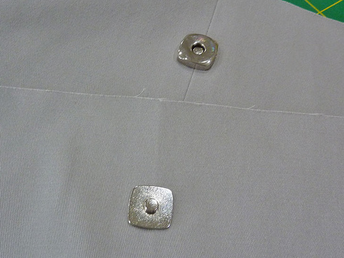 - Using the magnetic snap’s washer as a template, draw in cut lines for the snap’s prongs. The magnetic snap should bridge the seam and be centered top to bottom within the accent band.