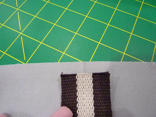 - Find the accent band “binding” again. For these steps you are working with the front of the band – the side that will show on the bag exterior.