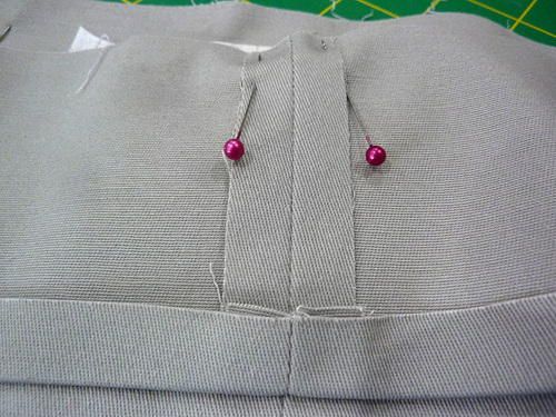 - Align the center pin point of the pocket top with the seam of the band. Then pin in place across the pocket.
