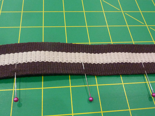 - Find the two 18” lengths of webbing. Find the exact center point of each length and mark this point with a pin, then measure 2½” to the left of center and 2½” to the right of center, adding marking pins at both of these points.