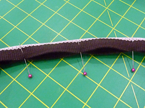- Pin in place with the raw end of the webbing flush with the raw edge of the band. Check to make sure there are no twists in the loop of the shoulder strap. Machine baste each end in place.