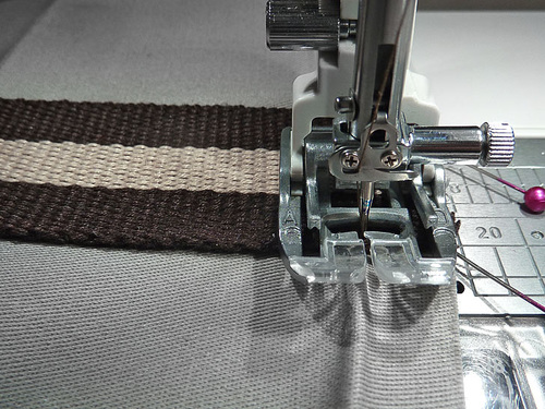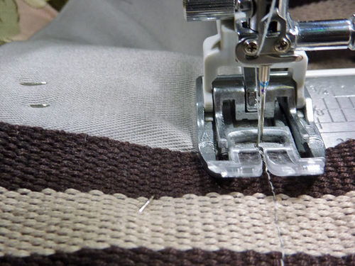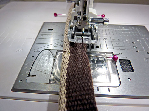 - Re-thread the machine with thread to best match the accent band in the top and bobbin. Keep the slightly lengthened stitch. If you have a free arm on your machine, now it a good time to use it as it will make sewing around the top easier.