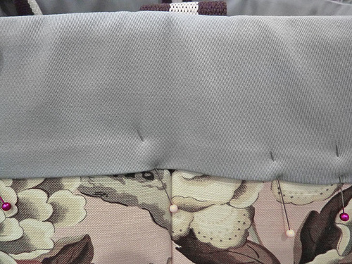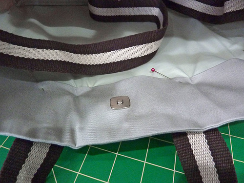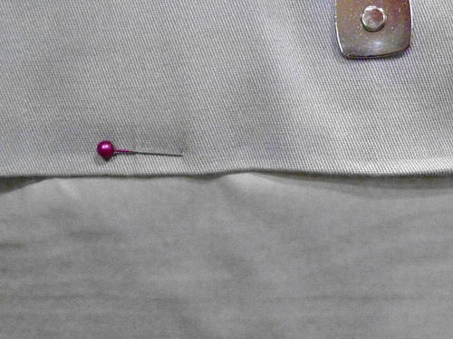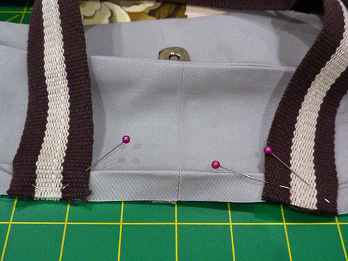 - Un-pin the band along the interior of the bag; leave it pinned in place along the exterior of the bag. Unfold the band so the inner layer (think of it as a facing) is laying out and away from the top of the bag.